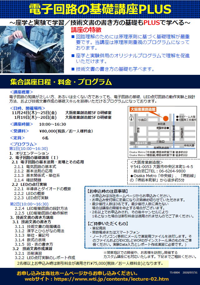 座学と実験を併用し、PLUSで技術文書の書き方も学べる実践的な基礎講座です。 回路理解のためには原理原則に基づく基礎理解が重要です。本講座は原理原則重視のプログラムになっております。 【画像をクリックすると拡大表示します】 詳細コンテンツへのリンク |