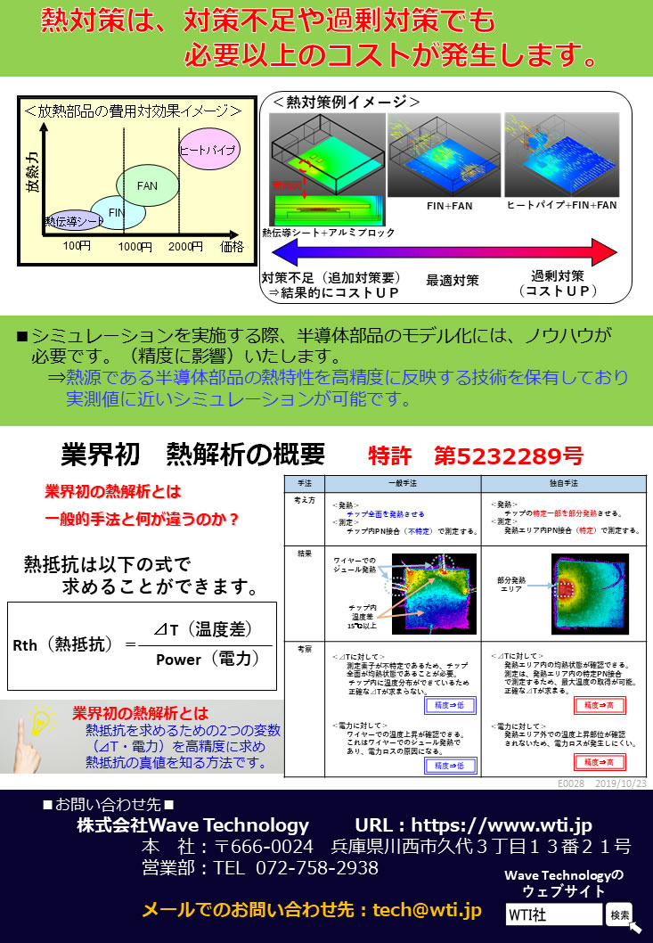製品開発で熱的な課題を抱えておりませんでしょうか? 電気、構造の協調設計を得意としており、半導体部品の熱特性を高精度に反映する特許技術を保有しております。 WTIでは、設計のフロントローディング化を推進しておりますので、熱に関するお悩みありましたらお気軽にご相談ください。 【画像をクリックすると拡大表示します】 詳細コンテンツへのリンク |