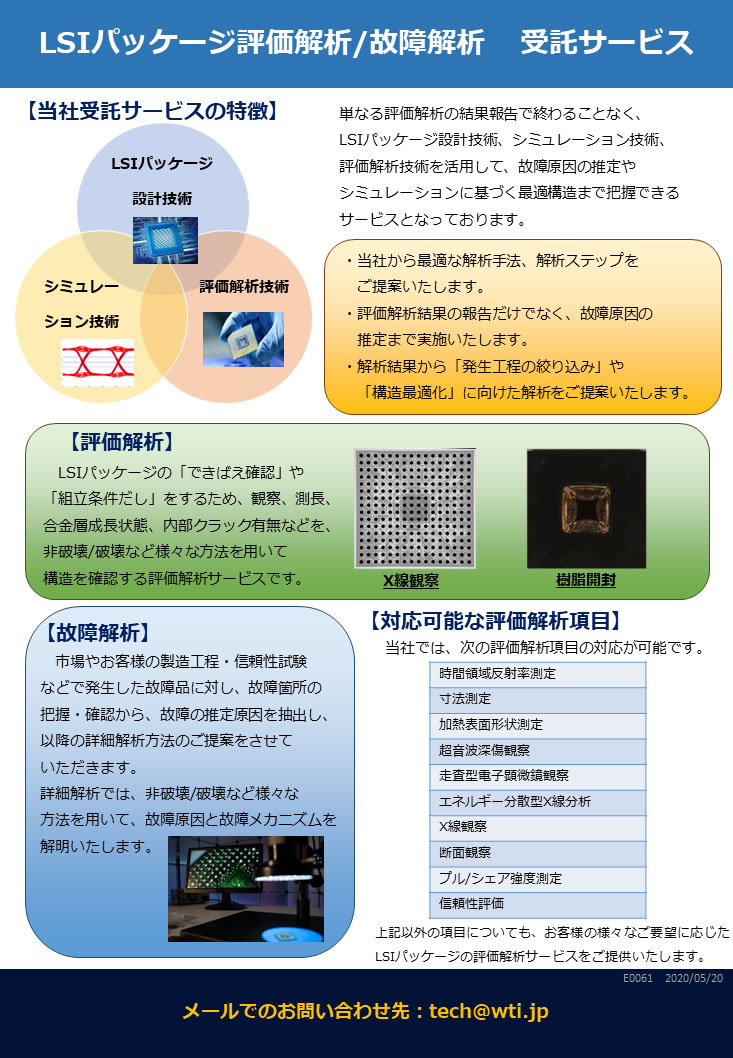 半導体パッケージの故障解析でお悩みではないでしょうか? 単なる評価解析の結果報告で終わることなく、LSIパッケージ設計技術、シミュレーション技術、評価解析技術を活用して、故障原因の推定やシミュレーションに基づく最適構造まで把握できるサービスとなっております。 【画像をクリックすると拡大表示します】 詳細コンテンツへのリンク |
