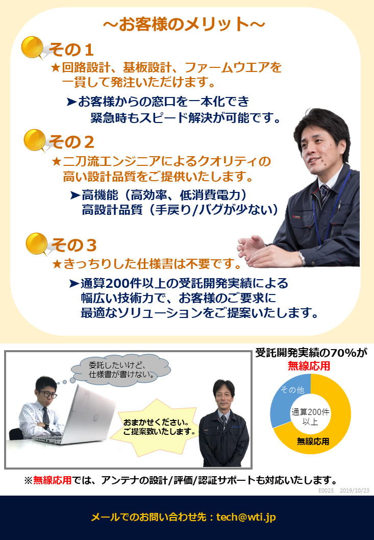 無線化するための委託先に対して、きっちりとした仕様書は必要ありません。 お客様の描く製品イメージを実現させるシステム構成をご提案いたします。 ハード、ソフトともにできるエンジンニアが在籍しているため、高設計品質の無線化対応が可能です。 【画像をクリックすると拡大表示します】 詳細コンテンツへのリンク |