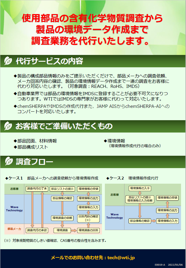 環境負荷物質調査でお困りではないでしょうか? 使用部品の含有化学物質調査から製品の環境データ作成まで調査業務を代行いたします。 【画像をクリックすると拡大表示します】 詳細コンテンツへのリンク |